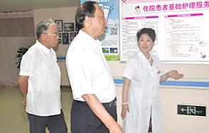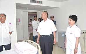 原国家卫生部副部长曹荣桂(中)、原北京大学副校长吕忠生(左1)与沈阳京科医院医院业务院长汪桂兰(右1)参观住院部病房